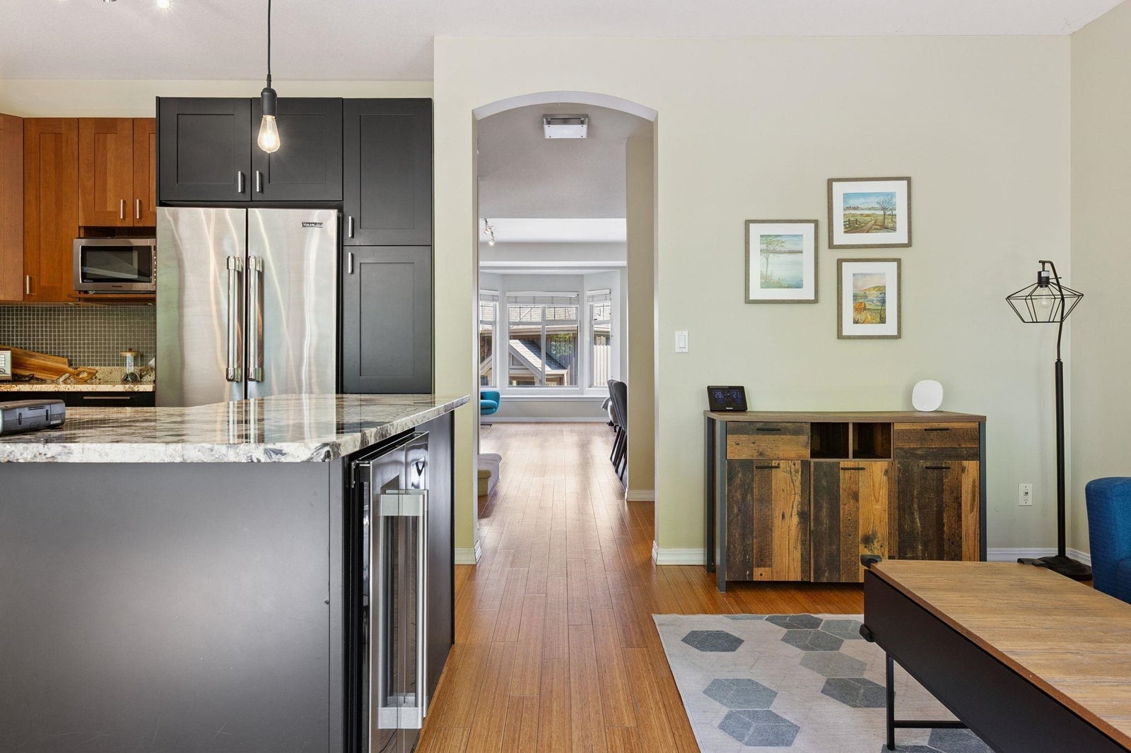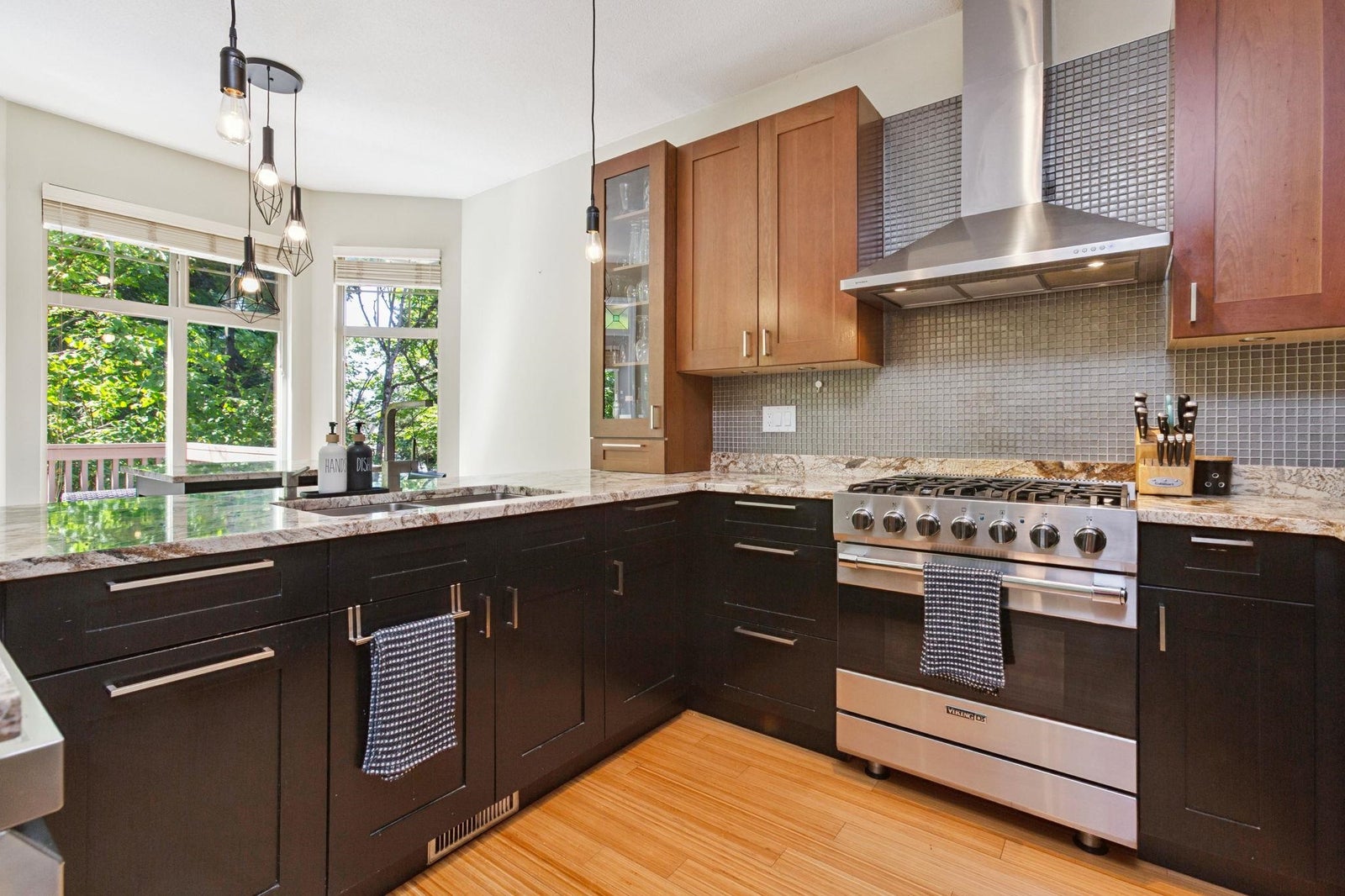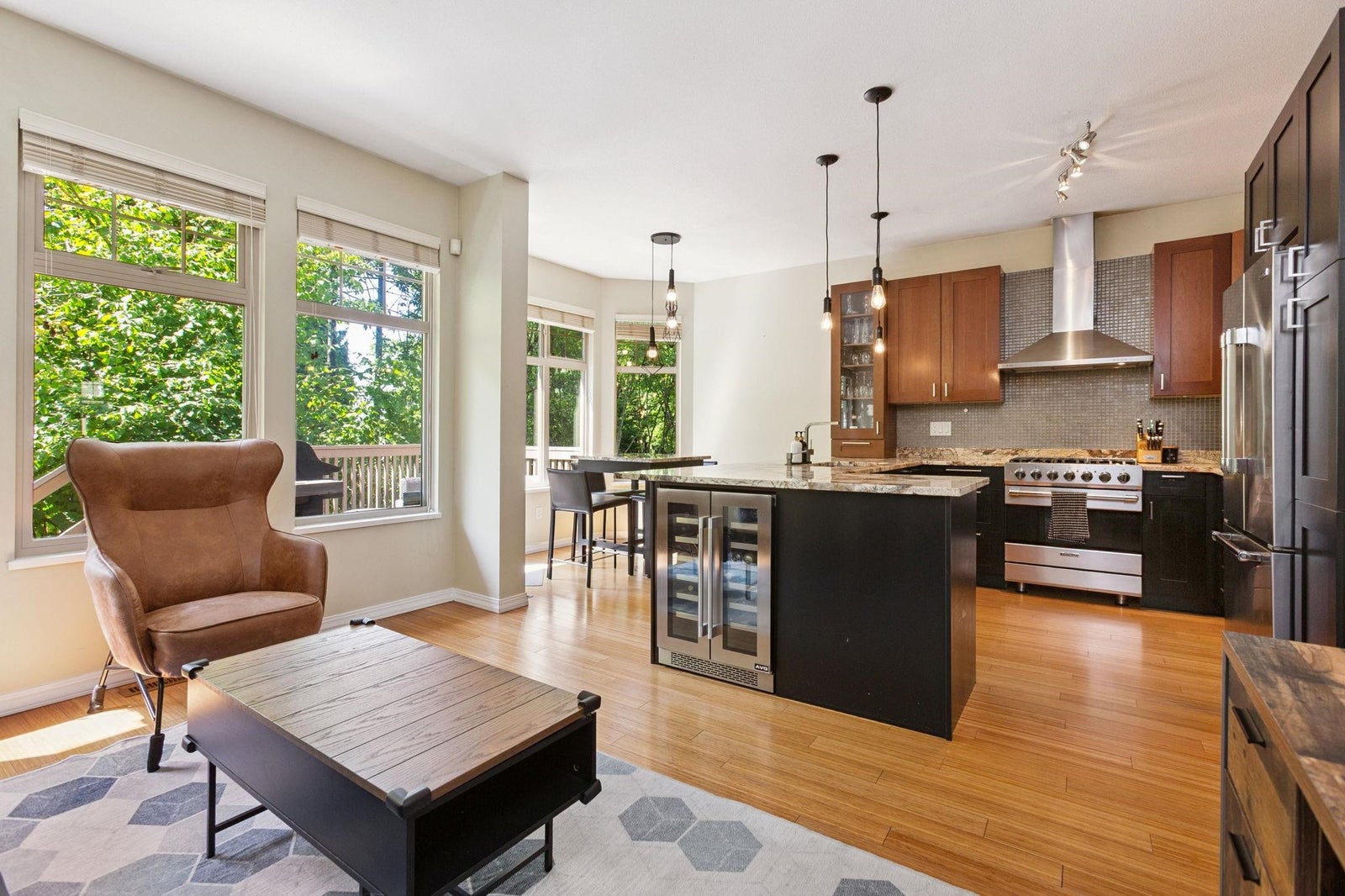 RENOVATED DUPLEX STYLE TOWNHOUSE WITH AIR-CONDITIONING in desirable CRESCENT HEIGHTS. 2,123SF of well appointed, functional living space over 3 spacious levels. The gourmet kitchen features top of the line Viking appliances, granite counters and custom cabinetry, flowing on durable hardwood flooring into the family room, dining room and living room with cozy gas fireplace, bay window seating and overheight 9' ceilings. Off the kitchen is a sunny deck with additional grass for pets! Upstairs are 3 spacious bedrooms including oversized primary with walk in closet and 5 piece ensuite. Below is a fourth bedroom and bathroom - perfect for in-laws or nanny quarters. Appreciate lush treeline views, Hunter Douglas blinds, designer lighting and side-by-side garage! OPEN HOUSE: SEPT 27 & 28 SUN 2-4