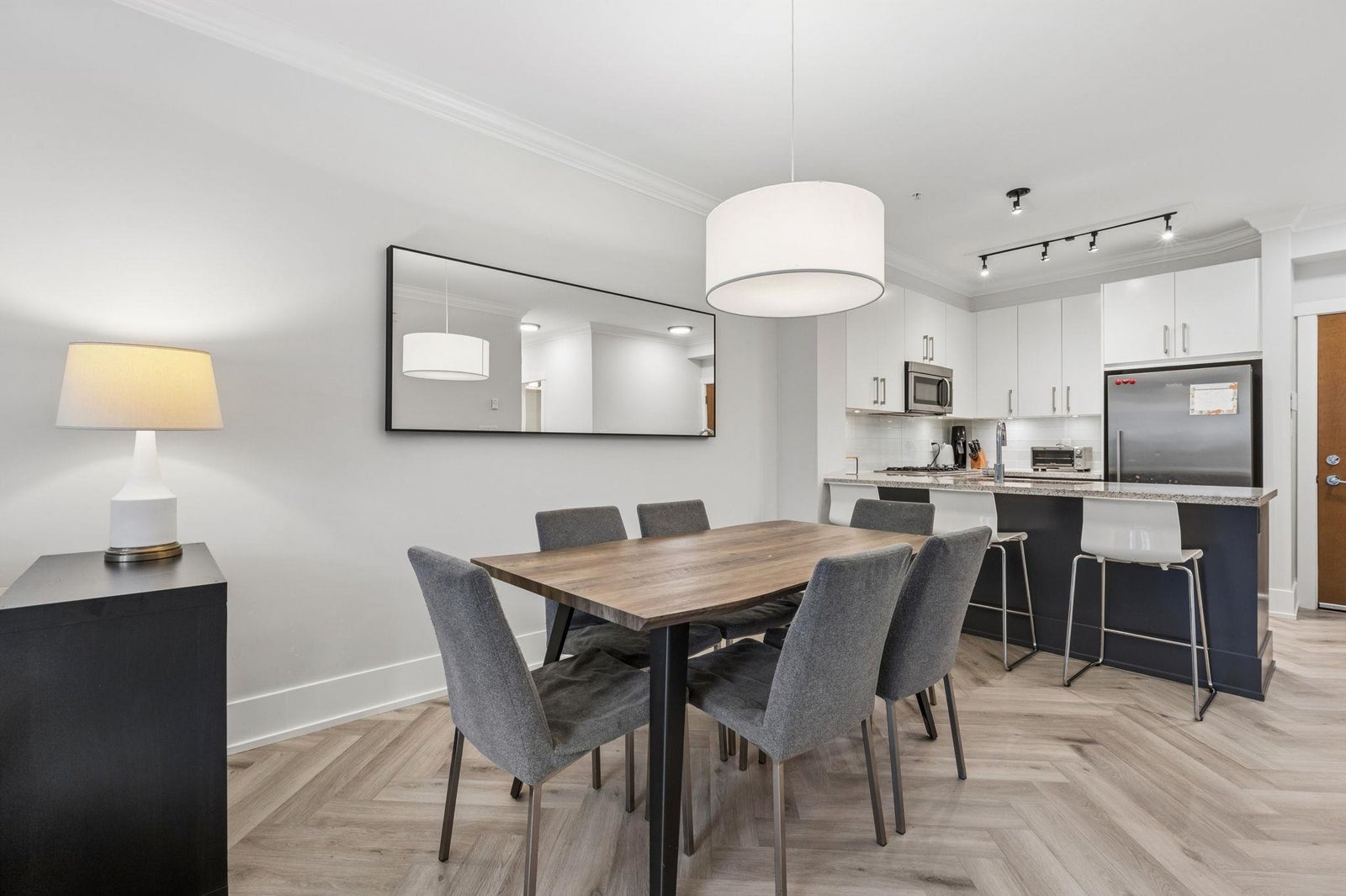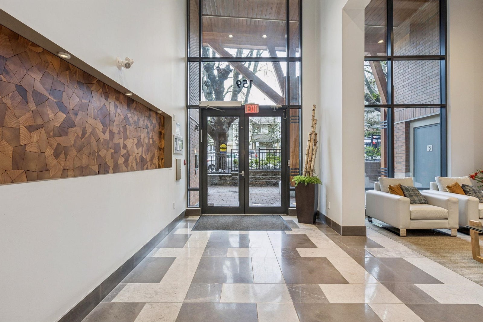 ANDERSON WALK BY POLYGON. Updated ground level, 860SF 2 bed, 2 bath home with private townhouse entry - perfect for a growing family and pet parents! This functional home features RADIANT HEATING, a sleek kitchen with ample storage, stone counters, stainless steel appliances, flowing on rich herringbone flooring into the open concept dining/living room. Spacious primary bedroom with walk-in closet and ensuite. Appreciate spacious windows, inviting lush tree-line views and the convenient 217SF covered patio... perfect for summer parties. Added crown moulding, contemporary window coverings and over-height ceilings. Building amenities include fitness centre, rec room and guest suite. All of this, steps to Lonsdale's best eateries and shopping! *OPEN HOUSE SAT/SUN MARCH 14/15 2-4P*